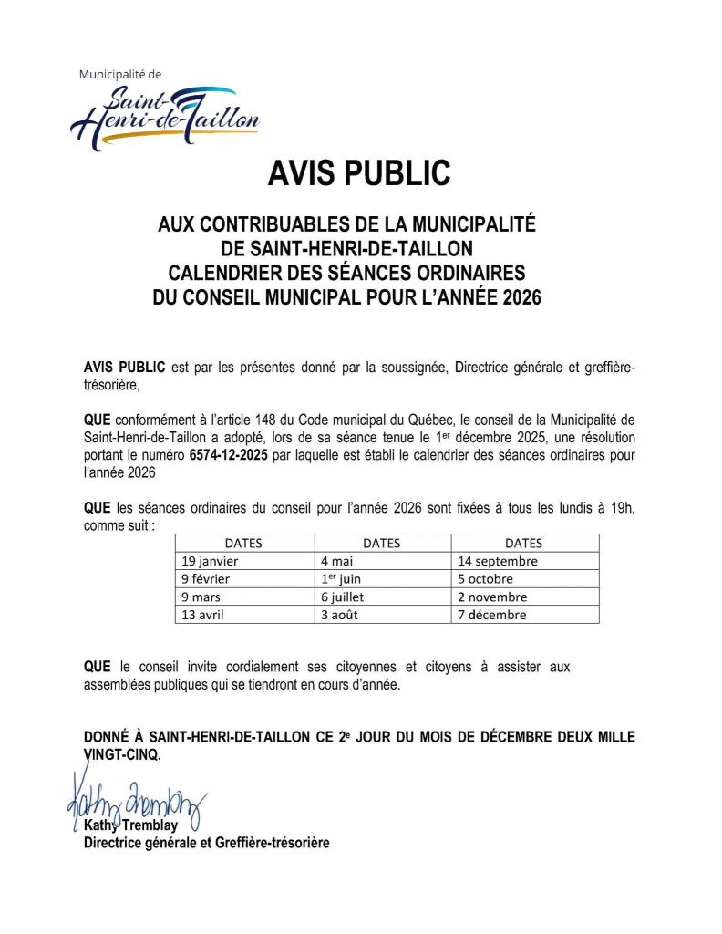 CALENDRIER DES SÉANCES ORDINAIRES 2026